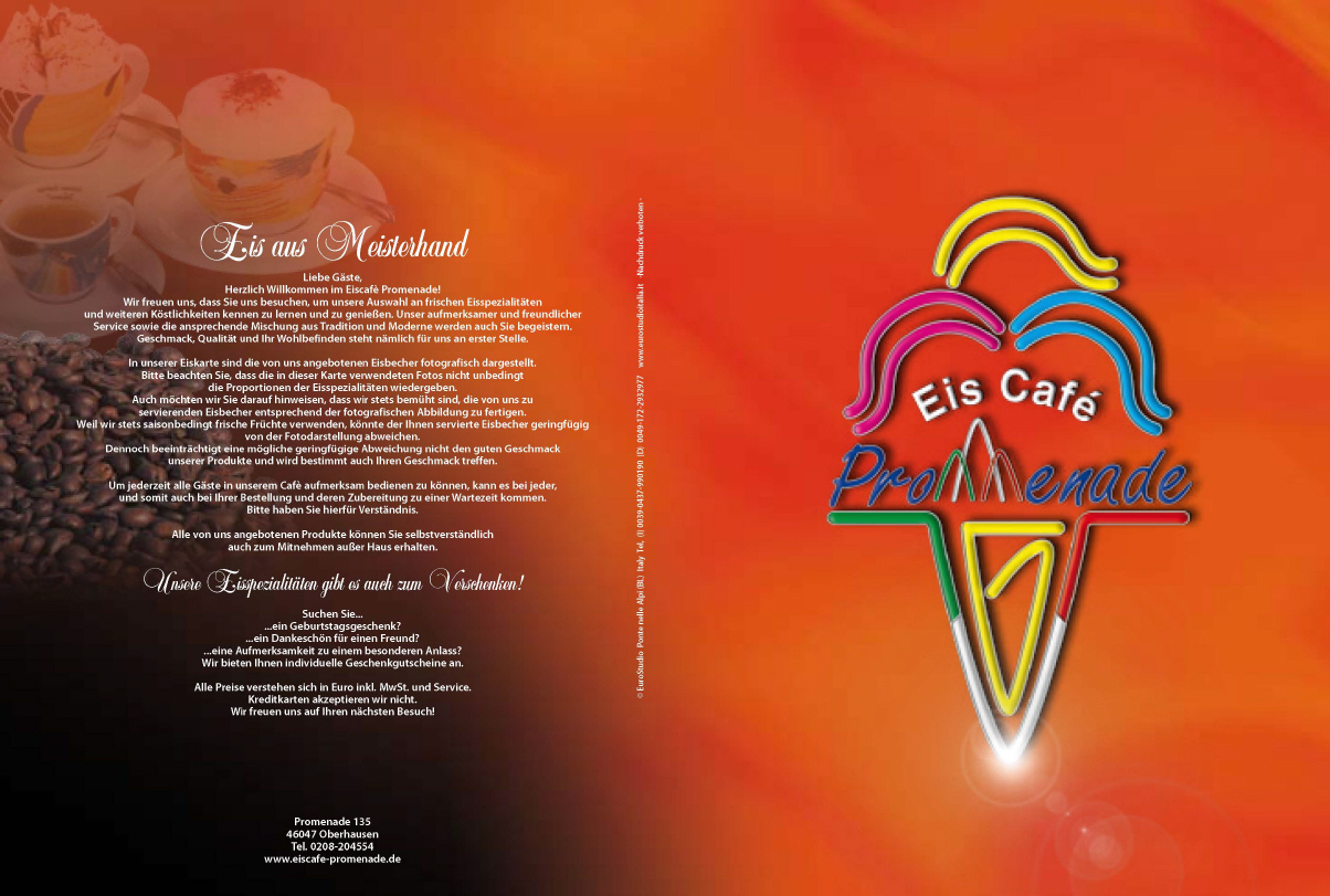 Beste Qualität, frische Zutaten und freundlicher Service - das schmeckt man, das ist Unsere Eiscafe Promenade im CentrO. Genießen Sie bei uns ein vielfältige Speisekarte und saisonale Gerichte wie in Italien. Blättern Sie doch mal durch die Speisekarte unten.